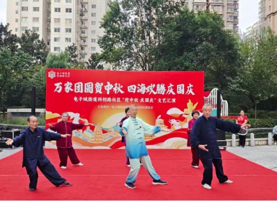 特色表演环节则展现了社区居民的活力与风采。柔力球表演《今天是你的生日》中,演员们手持柔力球拍,动作轻盈流畅,将柔力球的柔美与活力完美结合,为生日的祖国献上了一份独特的祝福。太极拳表演则刚柔并济,演员们的一招一式都尽显中华传统武术的魅力,让观众领略到了传统文化的深厚底蕴。