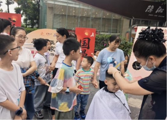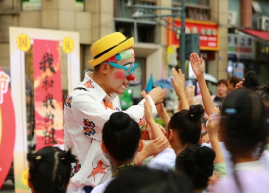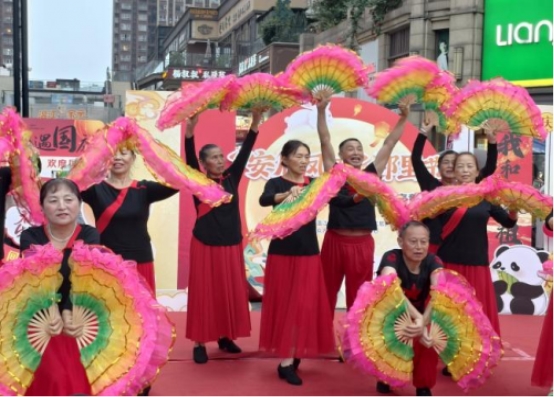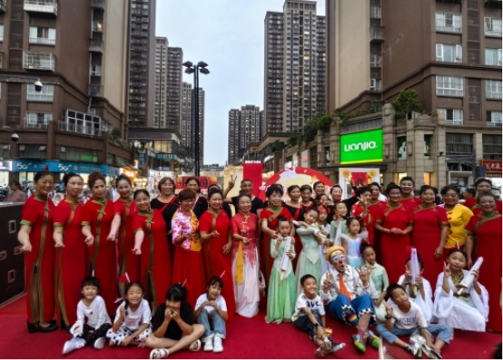 活动在悠扬的暖场音乐中拉开帷幕。文艺表演环节精彩不断:凤仪走秀队率先登场,队员身着华服演绎舞蹈《红枣树》,随后以《祝福祖国》主题走秀传递爱国情怀,整齐步伐与饱满精神令现场氛围持续升温;红凤乐队献上《民歌联奏》,悠扬旋律引发现场观众轻声应和;张老师团队带来的扇子舞《欢聚一堂》,其欢乐喜庆的氛围让居民们沉醉其中;心为艺术学校学员接连呈现《梦想的列车》与《青城山下》两支舞蹈,以童真活力燃动全场;特邀民间艺术家则以新奇有趣、互动性强的滑稽表演将活动推向高潮,精湛技艺引发观众惊叹,孩童纷纷簇拥台前探寻奥秘。