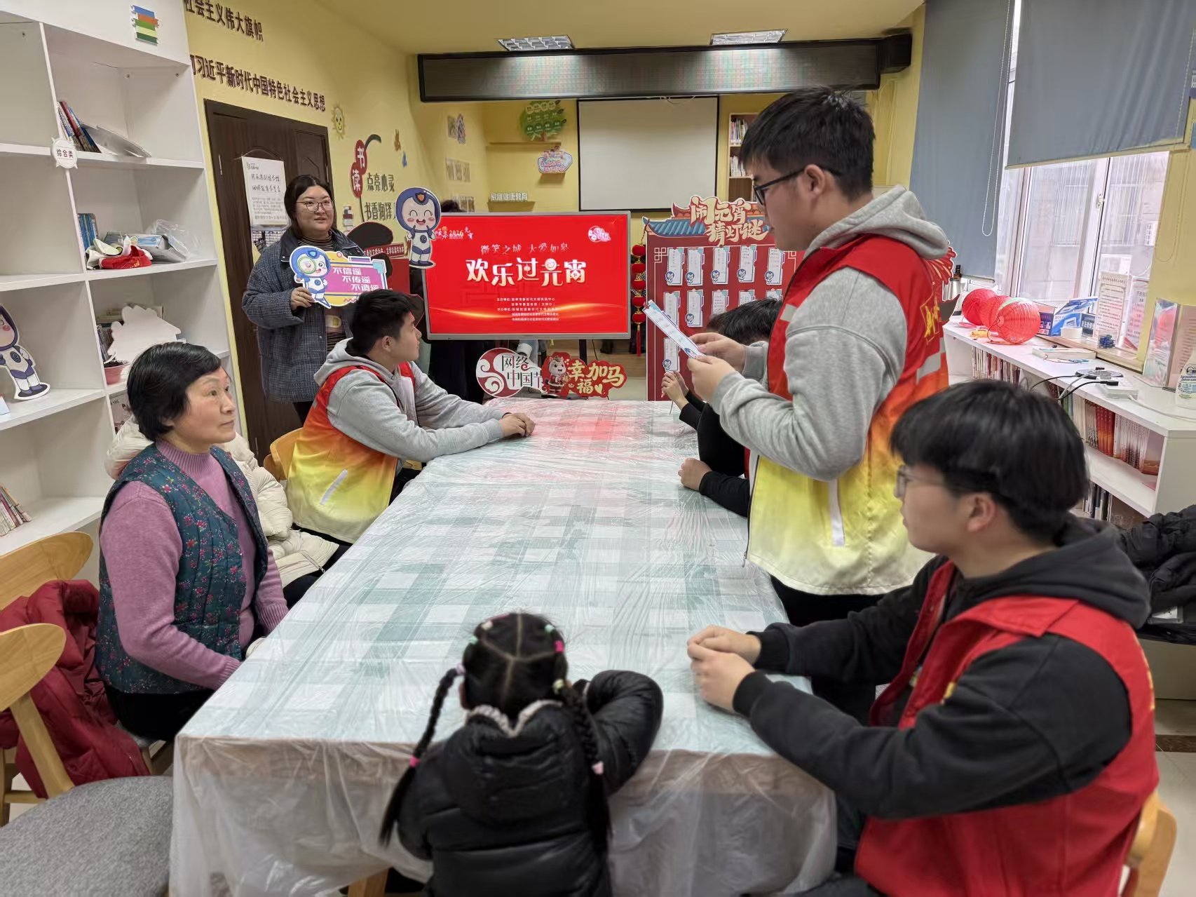 随后的趣味灯谜环节,退役军人志愿者们手持谜面,引导居民参与竞猜,内容涵盖国防知识与节日习俗,现场掌声、欢呼声不断。