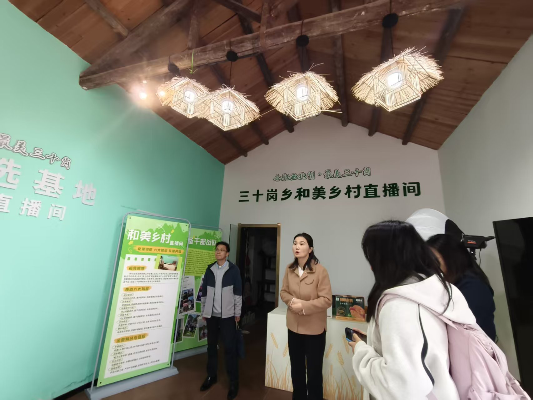 调研团队首先来到三十岗乡和美乡村直播间,崔岗村党支部书记张婷婷向团队详细介绍了直播间的建设初衷、运营现状与 “岗上优选” 助农品牌的打造历程。她提到,崔岗村作为三十岗乡和美乡村建设的标杆村,依托 “合肥西北望・最美三十岗” 的地域 IP,打造了这一兼具助农带货与乡村文化传播功能的直播间,聚焦本地特色农产品,通过直播带货、短视频推广等方式,打通农产品上行通道,让农户的 “田间好物” 走出乡村、走进城市,切实帮助村民增收致富。张婷婷书记还现场讲解了直播间的选品标准、运营流程、品牌故事打造思路,以及崔岗村在直播人才培育、供应链对接方面的探索实践,团队成员对崔岗村以电商赋能乡村振兴的创新举措给予了高度评价。