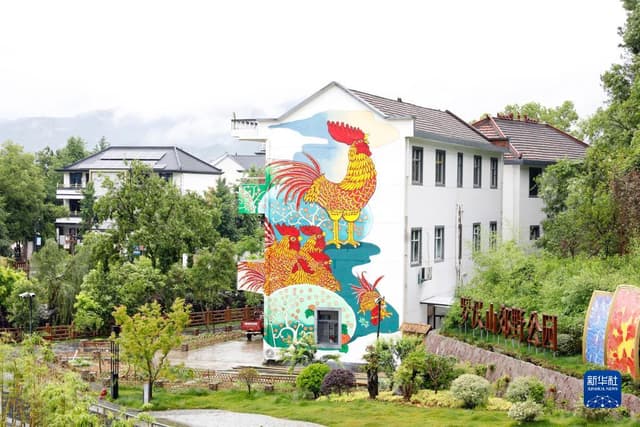 这是余东村建筑墙壁上的农民画大公鸡(5月11日摄)。新华社发 鲜红的大公鸡栩栩如生,金黄的稻穗映出农民丰收的笑靥,绿水青山间流淌着江南风光初冬时节,走进位于浙江西部山区的衢州市柯城区沟溪乡余东村,街巷间随处可见一幅幅色彩浓烈的墙画。 这些墙画出自当地村民之手。他们踩着梯子,手握画笔,在一面面白墙上画出极富乡土气息的艺术画。白天扛锄头,晚上拿笔头,卧室当画室,门板当画板当地的顺口溜正是余东画村里乡村
